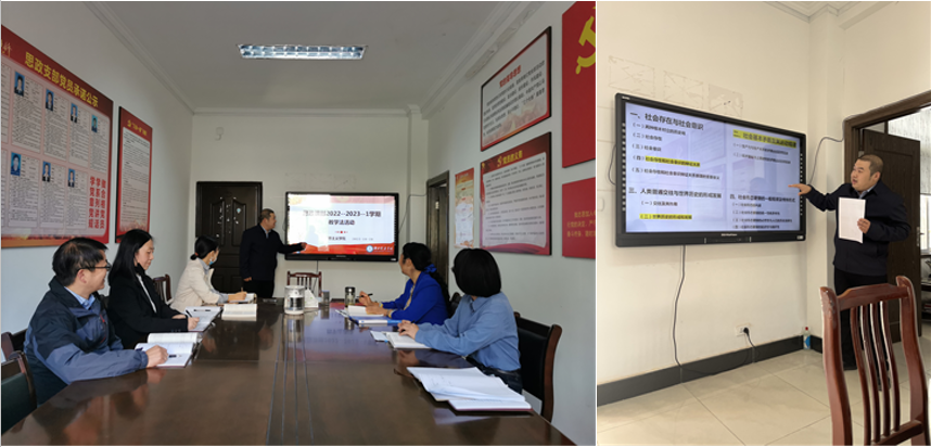 主讲教师王刚首先简单介绍第三章《人类社会及其发展规律》的概况,对第一节“人类社会的存在与发展”的重难点进行了深入分析与讲解,并对教学过程、原著引用、新思想融入、案例解析等问题分享自己的看法和理解。随后,王刚老师又分享了学习教育部最新课件的心得体会。在疑难问题探讨环节,王刚老师首先提出了一些自己的疑难困惑,课程组教师各自结合自身教学设计进行了深入探讨。之后在座教师纷纷提出了自己在教学中遇到的一些疑难问题,在热烈的讨论氛围中大家相互启发借鉴,进一步开拓教学思路,优化了教学设计。