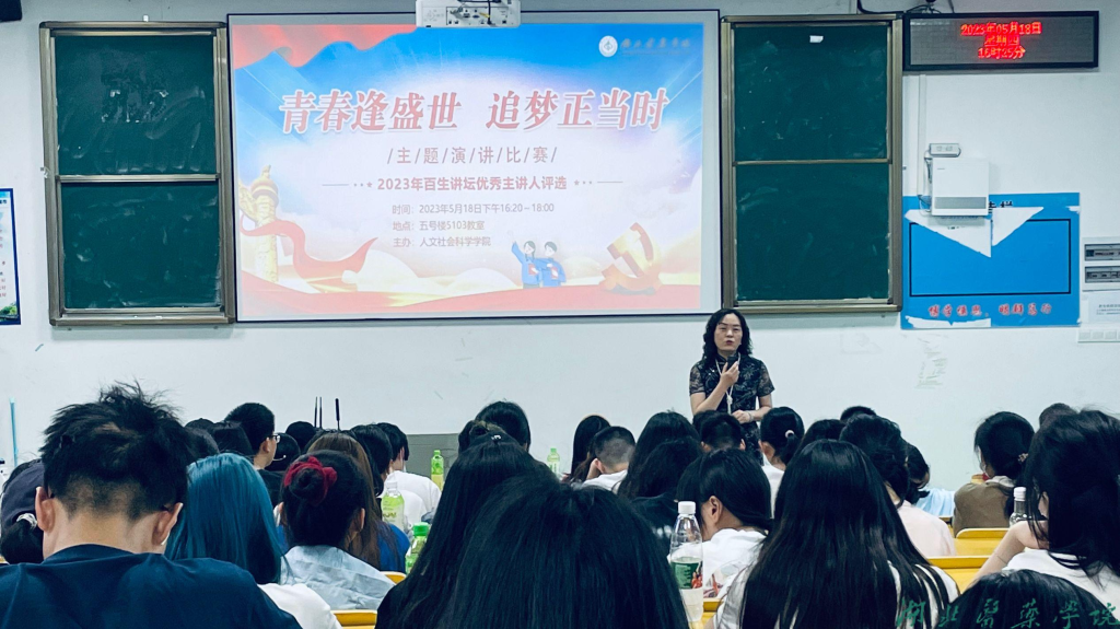 演讲比赛由22级张梦馨主持,4位老师和5位员工担任比赛评委,各班级推荐的10位员工参加比赛。活动开始前,刘艳丽副书记在致词中详细地给同学们讲了湖北省“百生讲坛”品牌活动的由来,她鼓励同学们要听党话、跟党走,深入学习领会习近平新时代中国特色社会主义思想和党的二十大精神,自觉地把个人价值的实现与中国梦的实现结合在一起。