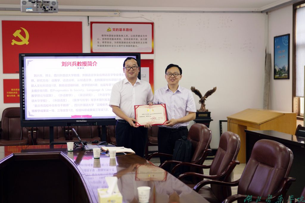 本网讯(通讯员 傅珏)6月29日下午,四川外国语大学博士生导师刘兴兵教授应邀来校进行学交流,并为太阳成集团tyc33455cc教师带来《国社科项目申报技巧及经验分享》专题讲座。正校级干部、原党委书记涂汉军出席本次讲座并为刘兴兵教授颁发客座教授聘书。活动由太阳成集团tyc33455cc经理刘冰主持。