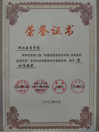 第三届“构建医患命运共同体”作品征集通知发布后,伦理学教研室何学军老师精心指导带领的暑期社会实践团队积极参与,取得了4个医患故事类一等奖、7个医患故事类二等奖的好成绩,何老师获“先进个人”称号。多年来何学军老师积极带领员工参加暑期社会实践活动,连续指导“可可梦”、“周丽急救”、“健康守护,走进千家万户”、“筑梦乡野”等多个实践团队,员工均表示受益匪浅。马菊华老师与直属附属太和医院医务科李瑞共同作者的课件“伦理视角下医患命运共同体的构建”获其他类一等奖。师生共同获奖、获奖等次高、参与频次多,为学校赢得了“最佳传播奖”。